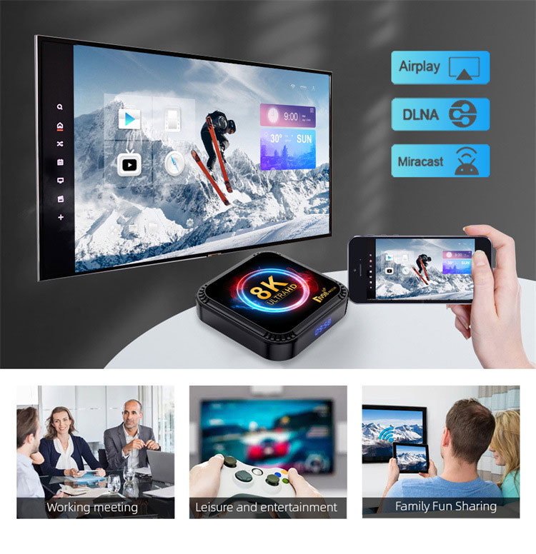 | I/O | 1*HDMI 4K*2K UHD Output 1*AV Support 2*USB 1*USB 2.0, 1*USB 3.0 1*IR receiver Remote receiver connect 1* RJ45 Ethernet; Support 100M 1* TF CARD 1*DC |